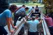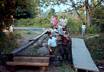 Of course the job isn't done until you clean up the mess (mess = old bridge). Since Lyle Newcomb really wanted to be there to help (but couldn't due to another appointment), it was decided either that (1) we better put the old bridge on his driveway so he'd know the job was done and didn't go running off to get his power tools ready, or (2) he would think it a "hoot" that we left him the old bridge to disemble (I think this was it). Whatever the rationale, he inherited a bunch of firewood. That evening he started the task with his chainsaw - it being the only way he could get into his garage. I never heard, but I suspect he didn't think it was quite as funny as the crew did. |