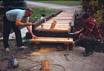 As you can see, the old bridge was kept nearby. It served as our work platform. Here Mr. Jones and Mr. Murray are cutting off the steel used to hold the beams together. I believe these were threaded rods running across to tie in the other beam. |