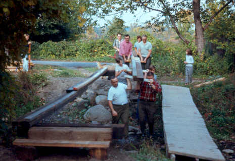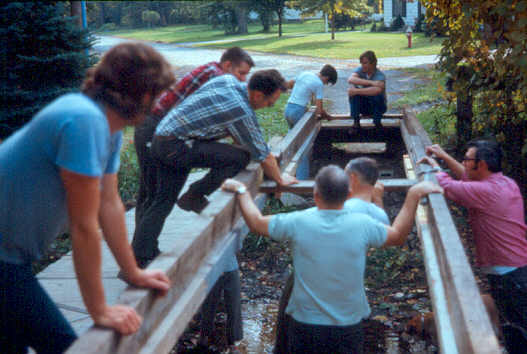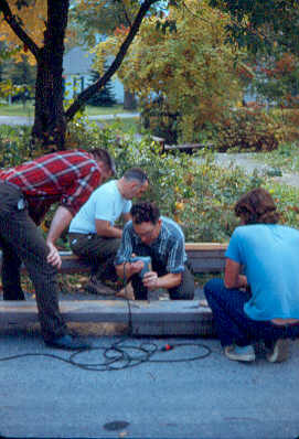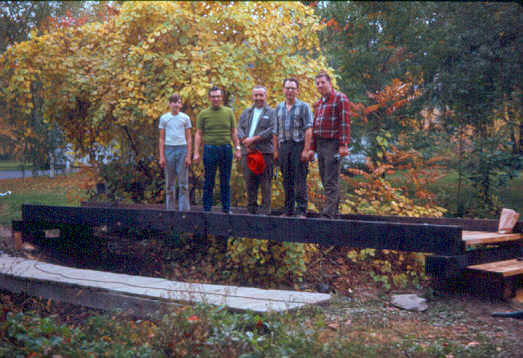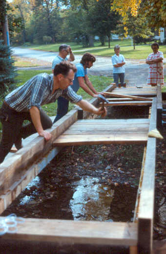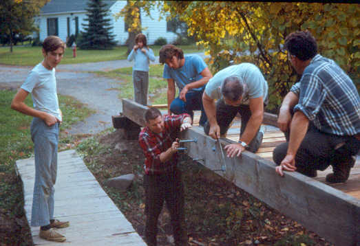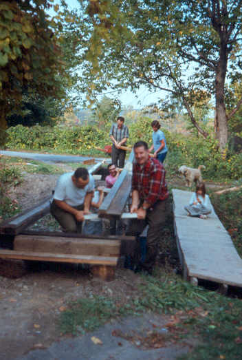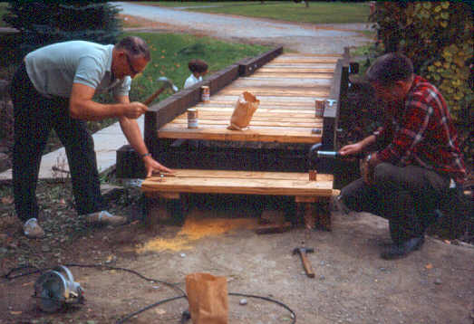 Mr. Jones and Mr. Murray put in the final nails in the steps. (Mark is either inspecting his father's